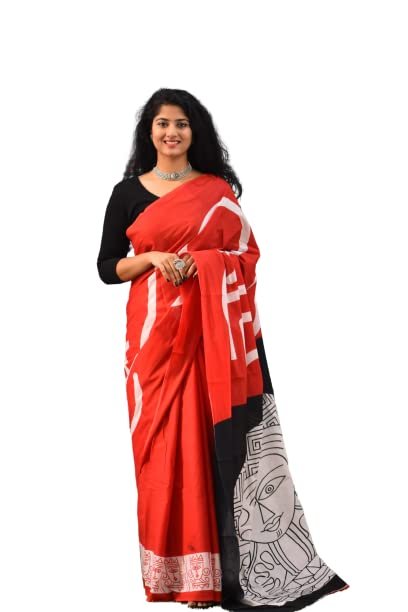 MAFATLAL हाथ प्रिंट कॉटन साड़ी, लाल