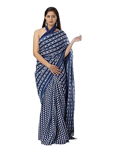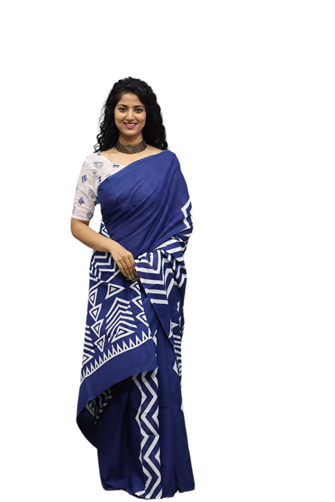 Shivanya Handicrafts Indigo Print कॉटन Mulmul साड़ी महिलाओं के लिए अटैच ब्लाउज पीस