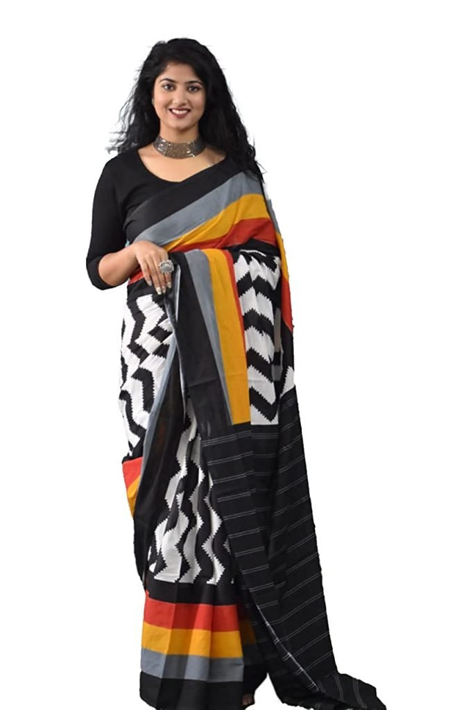 Jalther Handicraft महिलाओं के लिए Ikat हैंड ब्लॉक प्रिंट जयपुरी कॉटन मुलमुल साड़ी ब्लाउज पीस के साथ