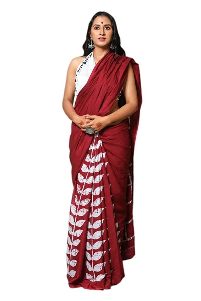 मैरून कलर की यह साड़ी जिसके 5 कलर उपलब्ध है, येलो (सरसो कलर), ब्लू, रेड, नीला, फिरोजी कलर। इस साड़ी की तींनी में वाइट कलर ब्लॉक प्रिंट से पत्ते की डिजाइन बानी है। जो बेहद ही सुन्दर लग रही है । यह साड़ी आपको ट्रेडिशनल एथनिक लुक देती है। इसके साथ आप हैवी earing पहन सकती है।