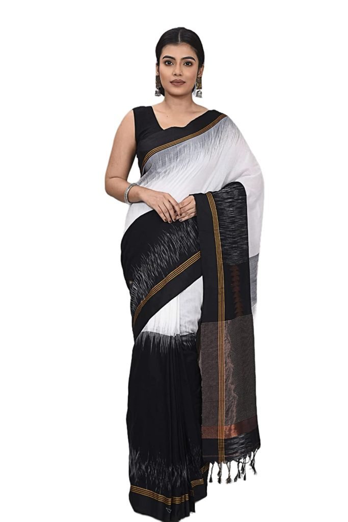 बंगाल इककट हैंडलूम साड़ी जिसे बुनकरों द्वारा हाथ से बुनाई करके तैयार किया गया है। सफ़ेद और काला रंग के कॉम्बिनेशन से इस साड़ी को तैयार किया गया है। बॉर्डर पे गोल्डन धागे से पतली सी पट्टी बनाई गयी है। जिससे इस साड़ी की खूबसूरती और भी बढ़ रही है। इस साड़ी को आप किसी शादी पार्टी, कॉलेज फंक्शन के लिए यूज कर सकते है। इस साड़ी के 8 कलर ऑप्शन उपलब्ध है जिसमे हर साड़ी को 2 कलर के धागो से से बुनाई करके तैयार किया गया है। येलो रेड, रेड ग्रीन, येलो फिरोजी, रेड वाइट जैसे कॉम्बिनेशन आपको मिल जायँगे।