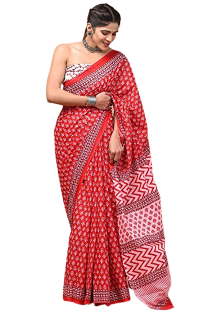 S R Creation महिलाओं के जयपुरी Ikat हाथ ब्लॉक प्रिंट कपास Mulmul साड़ी ब्लाउज पीस के साथ