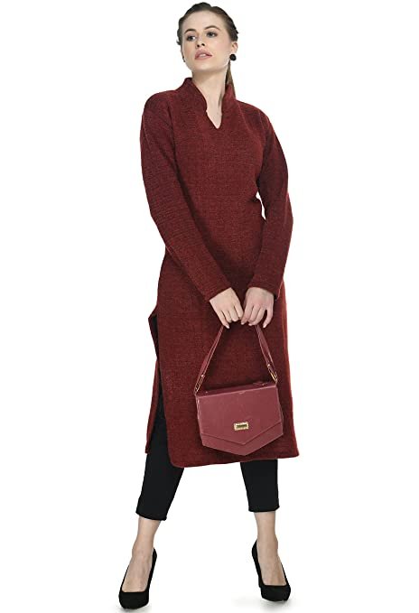 नो प्रिंट नो वर्क सिंपल एंड क्लासी वूलेन कुर्ती जिसे पहनकर आप बहुत ही खूबसूरत लगेंगी। फैंसी स्टाइलिस्ट मैरून कलर की यह कुर्ती बहुत ही ब्यूटीफुल है। Attractive और Elegant लुक के लिए आप इस कुर्ती को ट्राइ कर सकती है। इसे आप Ankle लेंथ लेगिस, लाइट क्रीम कलर या ब्लैक लेगिस के साथ पहन सकती है। Stylist look के लिए कंट्रास्ट में हाई हील्स वाली सेंडल और फैंसी Earing भी पहन सकती है।