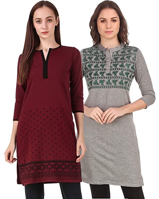 यह कुर्ती आपको कॉम्बो सेट में मिलेगी। यह कुर्ती Gray, और Maroon कलर में है, 3/4th स्लीव्स दिया गया है। दोनों कुर्तियों नैक के डिज़ाइन अलग दिया है, एक में राउंड नैक एंड दूसरी में वन कॉलर बनाया गया है। इसे आप Comfortable डेली यूज के रूप में पहन सकती है। इसमें और भी कलर Available है। फेब्रिक मेट्रिअल वूलन यूज किया गया है। इसे आप सॉर्ट लेगिस, जीन्स के साथ पहन सकती है। साथ ही इस कुर्ती के साथ आप वूलेन स्टाल का भी यूज कर सकती है।